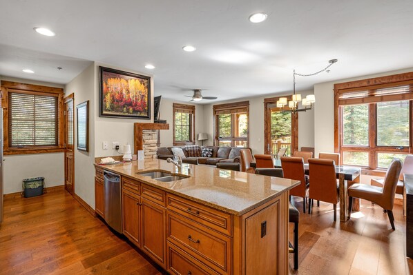 Perfect size for our family of 5. Very clean and had everything needed. Quick response from housekeeping for restock needs. Loved the full size kitchen and in unit washer/dryer. Very comfortable living room space for evening movie time—my kids loved the movie rentals in the lobby! Great location. Easy downhill walk to Main Street, and the free shuttle drops off right out front. Would definitely stay here again.