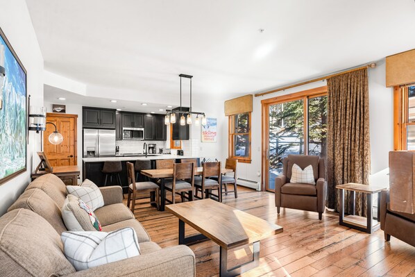 Updated, quiet condo on Main Street! Walk into an inviting living space with brand new kitchen, open layout, large windows and gas fireplace. Walk to anything in Breck or hop on the free trolly. Master bedroom features a king with attached bath while the guest bedroom has a queen plus bunk bed and its own attached bath. In-unit laundry and detached 1 car heated garage are other bonuses. Onsite hot tubs plus access to heated pool, hot tubs, fitness center and steam room all open year round.