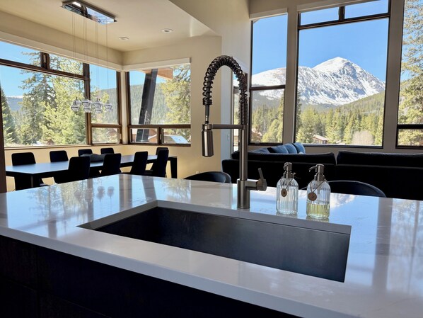 The main level features an open-concept living space with a gas fireplace, smart TV, and a fully equipped chef’s kitchen with high-end appliances—perfect for shared meals and gatherings. Large windows throughout the home flood the space with natural light and showcase breathtaking views of Mount Quandary from nearly every room. Downstairs, unwind in the bar and lounge area—great for games, movies, or après-ski drinks.