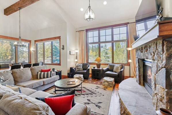 Living & Dining Areas: The kitchen opens to the spacious living room, complete with an oversized flatscreen TV, plush seating, and a gas fireplace for cozy evenings. The dining room accommodates eight guests beneath a stunning chandelier, with additional seating for five at the kitchen counter.