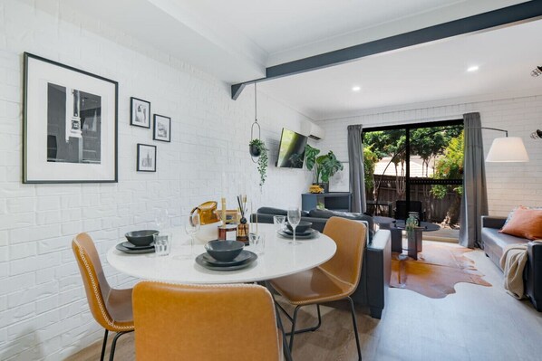 All guest rooms at Modern 2BR Townhouse Walk 2 Shops | Pool + Parking have thoughtful touches, such as air conditioning, as well as amenities, such as dining tables and WiFi.