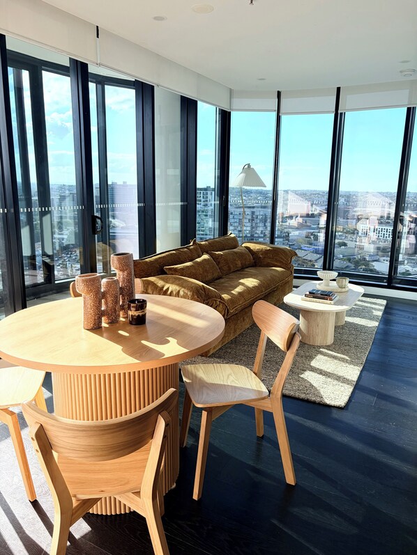 All guest rooms at Stunning skyline apartment with infinity pool, gym and free parking feature comforts, such as air conditioning, in addition to amenities, such as dining tables and kitchen islands.