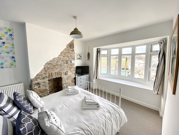 Master Bedroom - Spacious room with King sized bed and pocket sprung mattress, bedside tables, reading lamps and chest of draws. A large bay window seat to enjoy the amazing views over the harbour and out to sea. 24" TV.