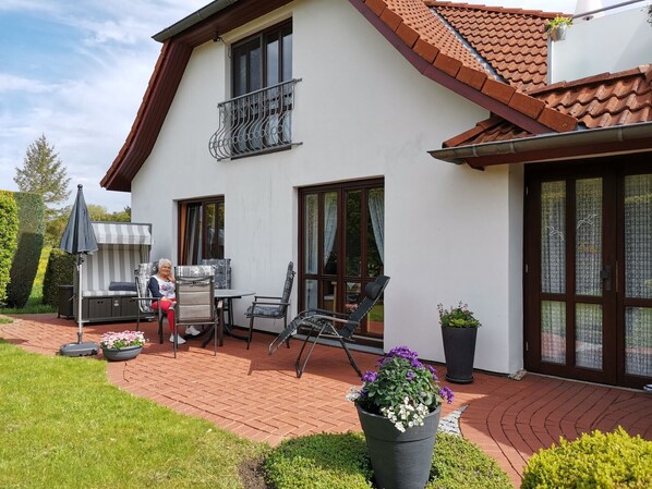 Die Terrasse mit Liegestuhl und Strandkorb lud zum Verweilen ein.