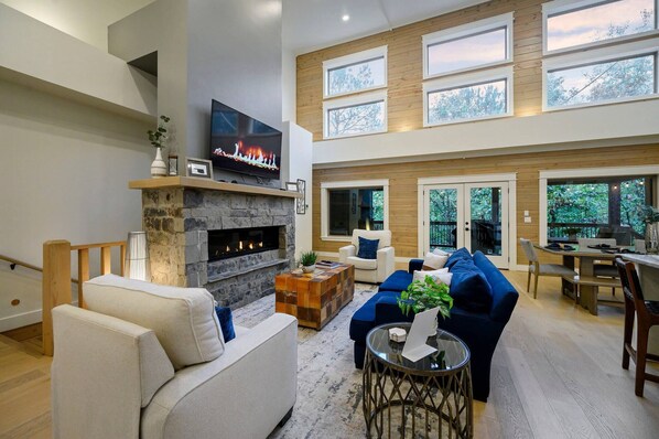 Step inside to a spacious open-concept living area featuring floor-to-ceiling windows, a custom stone fireplace, and stylish furnishings throughout. The fully equipped kitchen includes stainless steel appliances, a drop coffee maker, a single-cup Keurig, and all the cookware you’ll need. Enjoy meals at the custom dining table for six, or gather around the kitchen island that seats three.