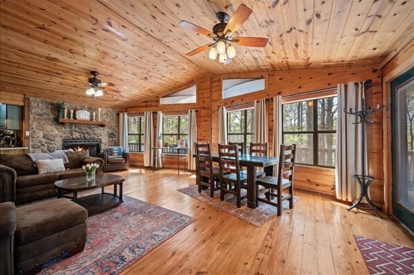 Inside the Cabin: Step into a warm, rustic space designed for relaxation. The open-concept main living area features comfortable seating around a cozy stone fireplace and a Smart TV. The fully stocked kitchen has everything you need to prepare meals, which can be enjoyed at the large dining table. For those needing to stay connected, a dedicated workspace is available. We also provide children's books and toys.
