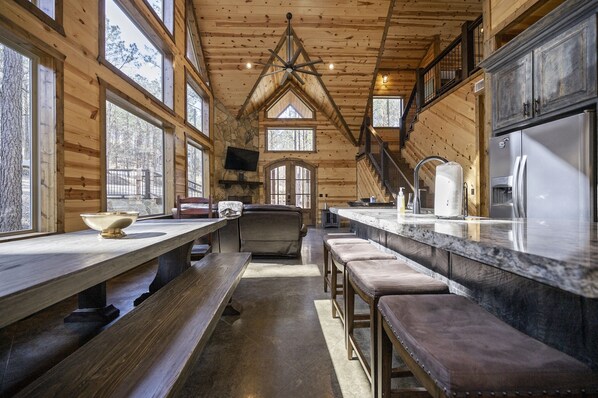 The kitchen boasts top-of-the-line appliances and all the tools you need to prepare group meals. Keep groceries and snacks organized in the modern gray-toned cabinets while the full-size refrigerator will keep drinks cold and perishables fresh. Brew coffee in the coffee maker and enjoy it on the granite island that doubles as a breakfast bar, or out on the patio overlooking the trees. For celebratory feasts and family meals, the picnic-style dining table has plenty of seating for big groups. The cozy setting is perfect for sharing good food and making memories with friends and family.