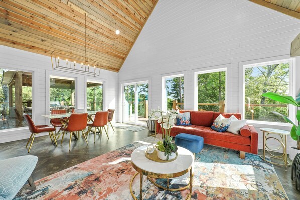 Make your way to the inviting open-concept living and dining spaces of the main floor. Step out through the sliders to experience the spectacular forested splendor or view the scenic mountain surroundings via the fully windowed walls as you sit by the fireplace. Relax in the comforts of the designer furnishings, both indoors or out, and lose yourself in the ambience of this peaceful, restorative oasis. You’ll love the dazzling artwork and pops of color.