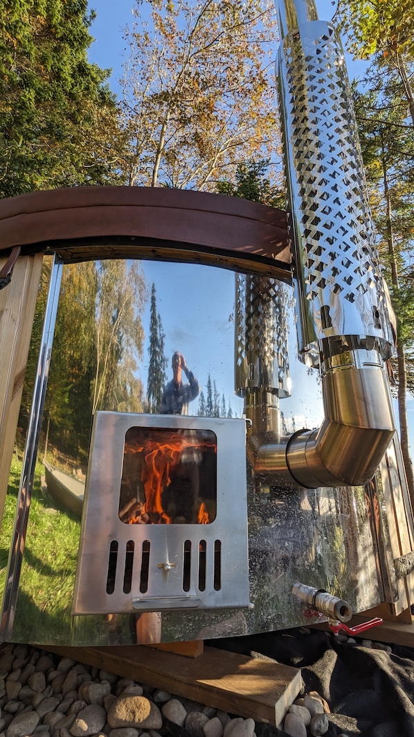 6 person round Scandinavian wood burning hot tub.