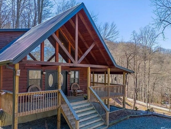 Beautiful log Cabin, hot tub, fire pit, gas fireplace, and wraparound porches.