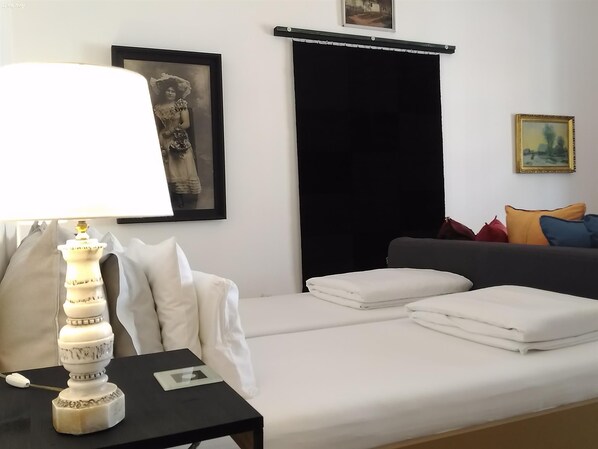 The bigger bedroom has a king size, twin beds with thick comfortable mattresses . As this room is 26 m2 size you can enjoy a lounge area in this room . Huge window as provide view to the other palaces and left side the beautiful Buda hills , Margaret Island and Danube river all together .
