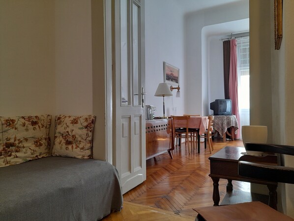 Within 2 mins walk to the Danube and 4 mins walk to a major tram route. In a historic district that is very walkable. The apartment has pleasant historic character with minor inconvenience (bathroom door a little hard to close). Excellent for a long stay. You'll appreciate the neighborhood.