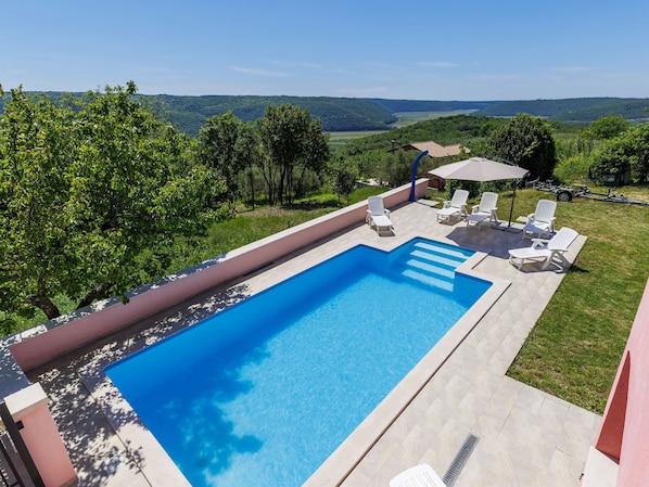 9 km from Buje: Semi-detached house "Villa Gabi", 3 storeys. In the hamlet Lozari, in a quiet, sunny position on a slope. Private: property 500 m2, swimming pool angular (7 x 4 m, depth 150 cm, seasonal availability: 01.May. - 01.Oct.). Outdoor shower, garden furniture, barbecue. In the house: internet access. Shop 5 km, supermarket 9 km, restaurant 5 km, bus stop 5 km, railway station 33 km, pebble beach 23 km, rocky beach 23 km. Golf course (18 hole) 26 km, walking paths from the house, cycle lane 20 m. 4-room semi-detached house 111 m2 on 3 levels. Living/dining room with open-hearth fireplace (only for decoration), satellite TV. Exit to the terrace, to the swimming pool. Kitchen (4 hot plates, oven, dishwasher, kettle, microwave, freezer, electric coffee machine). Shower/WC. Upper floor: (exterior staircase), 1 room with 1 french bed (160 cm, length 200 cm), air conditioning. Bath/bidet/WC. 2nd upper floor: 1 room with 1 bed (90 cm, length 200 cm), 1 french bed (160 cm, length 200 cm), air conditioning. 1 room with 1 french bed (160 cm, length 200 cm), air conditioning.
