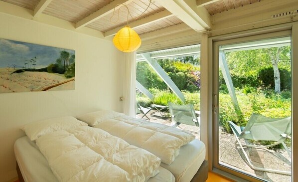The holiday home is equipped for 4 people and is mainly decorated with vintage design-furniture. The living room with dining area offers views over the flowery garden. The attic space is in open connection with the living room and is accessible by an open staircase. This sleeping area contains a comfortable wooden double bed. The other bedroom is located on the ground, can host two people and has access to the sunny garden. The small but charming kitchen is equipped with all essentials. The bathroom (incl.toilet) is basic.
