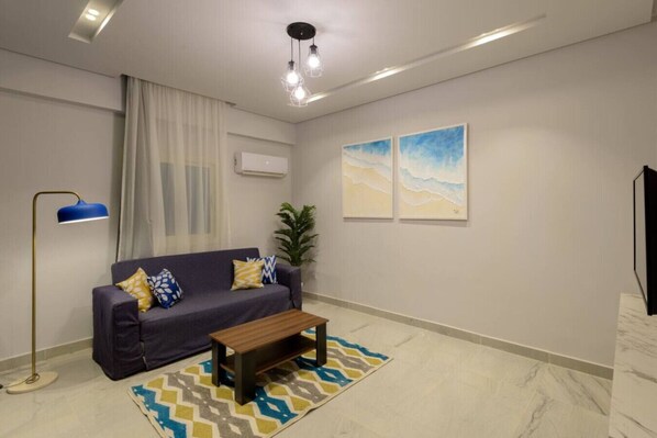 Stay in this bright and modern 2-bedroom, 2-bathroom apartment located on North 90 Street, New Cairo. Perfect for families, friends, or business travelers, this apartment features 2 queen beds and a sofa bed, comfortably sleeping up to 5 guests. The space includes a kitchenette, a spacious living area, and modern amenities like smart TVs, free WiFi, and air conditioning. Enjoy easy access to shopping and dining in one of Cairo's most vibrant districts.