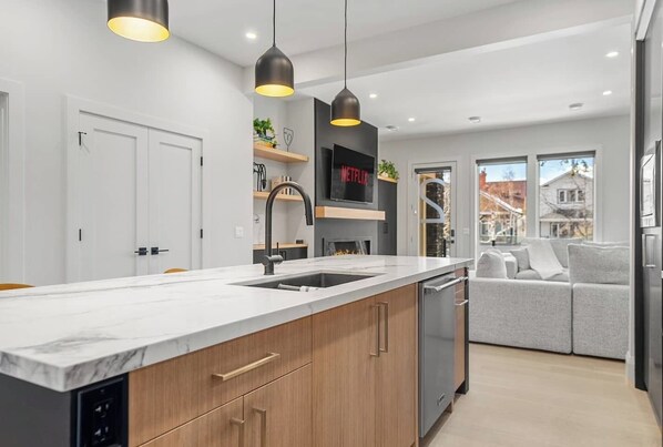 - 2 Queen beds - Private garage for 1 car only (Free street parking upon availability) - Luxurious master ensuite - Fully equipped gourmet kitchen - Complimentary Keurig coffee - Kitchen necessities - High-speed Wi-Fi - 55" Smart TV with FREE Netflix (no cable) - Fresh linens - Soft towels - Ironing board + iron - In-suite washer and dryer - Hairdryer - 1 parking stall