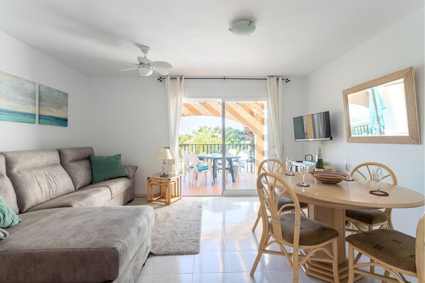 This vacation rental features a private outdoor space with an open terrace, a covered terrace, and a barbecue. Guests can also enjoy a shared outdoor area with a fenced pool, garden, children's pool, and outdoor shower.