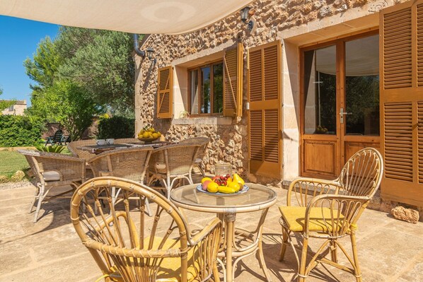 The exteriors are perfect to enjoy the good weather on the island, with an above-ground pool of 5 meters in diameter with a depth of 1.20 meters and several areas to sit and rest or enjoy a delicious barbecue. The property is fenced and the privacy is total. The one-storey house offers a simple style that exudes tradition but at the same time offers everything you need for a comfortable stay. In the living room, equipped with AC, you can sit and relax and watch TV-sat. The large eat-in kitchen offers a gas cooker and a wood-burning cooker for colder days. There is also a washing machine, iron and ironing board. Our guests have 2 bedrooms with AC to relax in. One has a double bed and en-suite bathroom with shower and the second has 2 single beds. In the house there is another bathroom with shower. Finally, we can prepare a cot and a highchair for you if you are travelling with your baby. The house is in the countryside on the outskirts of town. In Campos you have all the basic services for an independent stay. The property is not far from wonderful beaches with turquoise waters such as Ses Covetes or Es Trenc. To play golf you will have to go to Vall d'or, the nearest golf course. The first floor of the house is not available. Consult the advertiser for possible charges. Pets are not allowed. The holding of events is forbidden. There is exterior parking for 4 cars. Distances Beach: 16.6 km - Ses Covetes Airport: 38.4 km - Son Sant Joan Golf course: 19.5 km - Vall d'Or Town: 5 km - Campos Train station: 44.4 km - Palma de Mallorca Bus stop: 5.5 km - Campos Ferry: 47.9 km - Palma de Mallorca Hospital: 41.7 km - Hospital Son Llàtzer Tourist license: ETV/15320