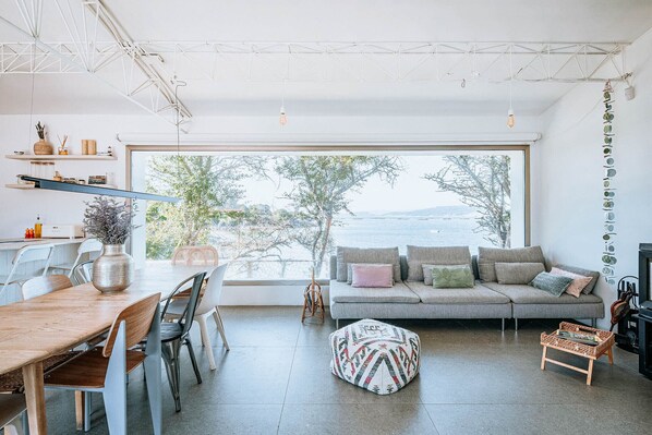 A peaceful beachside retreat, modern and cosy. The house is embedded between the sands of blue flagged Area Brava and a secluded cove. Anchored on the very shore of the bay of Aldán, our home is a trove of light, sand and murmuring waves to forge luminous family memories and bonds to last for a lifetime. Equally well-suited to action –paddle surf, kayaking, biking— and relaxation –smart projector, fireplace—, let the song of the Atlantic Ocean and our hospitality lull you into a delightful stay. A bit of history From the very moment we spotted the austere bearing of the original construction –a remnant of an old fish farm—, we became aware of the uniqueness of its location and its dazzling possibilities. The building evoked the melancholy of a stranded whale, or that of a boat wrecked against the rocks, and bore the mark of long-lasting oblivion. Today, it is a modern space, comfortable, vibrant with light and family life: a home we feel lucky to live in and proud to show. The environment We find ourselves on the Galician coast, in the so-called Rías Baixas. Here, the fury of the Atlantic Ocean fades into the greenery of the rocky wilderness and the land’s soft, almost embracing relief –a permanent contrast to the ubiquitous blue of the bays. No matter how much you may argue against it: for us, this is the most beautiful place on earth –rain or no rain. However, this is also the heart of what us, natives, like to humorously call the Baja Galifornia: an imprecisely outlined geographic area blessed with a warmer and sunnier microclimate than the rest of Galicia. Here, summertime and beach days may protract themselves until early October, and two or even three-week spells of hot, sunny weather –with daytime temperatures well above 25 degrees and nigh-to tropical nights— are typical, if unpredictable. The counterpart of long days raining cats and dogs is also, always, a possibility –therefore our infamous reluctance towards assertions and long-standing dependence on the words “it depends” to answer whichever question you may pose. Just in case, pack a raincoat. The house The house holds 100 square metres of living space and is surrounded by a 300-square-metre garden. The layout holds three bedrooms, two bathrooms, one kitchen, two dining rooms –one inside and another one outside, both suited to accomodate a minimum of eight people— and a magnificent living room. The space can lodge up to twelve people, while the parking space can hold at least five vehicles. Logistics should be no trouble for your vacation! The beach There is choice here. The house sits atop a small promontory facing both a little cove and the vast sandy stretch of Area Brava –consistently blue flagged year after year. A short two-minute walk will take us straight to our destination of choice. The cove is not private to the house, but it is indeed rather quiet and usually not busy. Fishermen do make use of it –especially divers— and it is not infrequent seeing them come out of the sea holding a freshly-captured octopus, or even a fearsome conger eel! Aside from our own presence on the beach, the beach is always present in our house. From there your will see, your will breathe and you will hear, constantly, the sea. The bedrooms Each of the three bedrooms delivers its unique perspective of the bay, which in turn floods the rooms with natural light. Every bedroom holds a writing desk and a spacious closet. Two of them also hold cradles. Everything, from the hue of the wooden furniture to the colours of the bedspreads, has been lovingly selected to create luminous, warm living spaces. Although every bedroom affords their guests a modicum of essential privacy, these spaces are conceived in the spirit of communal living: standard beds have been replaced with bunk beds –brand new, comfortable and reasonably spacious (1,35 x 2 m for the lower beds and 90 cm x 2 m for the upper ones). It is a cosy setup, inviting confidences between siblings by the light of a lantern, or the kind of conversations between friends that do not wane until well into the little hours. One of the bedrooms has its own in-suite bathroom, fitted with a chromotherapy shower tray system, while the remaining two share a second one by the hallway, equipped with a reain-effect shower dish. (Included: daily linen change) The kitchen Perfectly equipped for the daily battle of feeding ravenous groups of friends and families with children alike –starting by our own. Thus, we are very aware of every contingency that may arise when the little ones are at home: here you should find anything you may need for culinary purposes and beyond. Should you have any special needs, please let us know: we are just one message away and we will do our best to accommodate you. Besides all the necessary cookware, the kitchen relies on an island table to combine social life with the hustle and bustle of pots and milk bottles: you will learn to love it for its practicality, while enjoying some lively banter around it with a glass of wine at hand. Additional services and fares: - Show cooking – We are happy to arrange show cooking demonstrations in our kitchen for a price to be agreed upon together with you, according to the cost of the ingredients and number of guests. Do not be afraid to ask, it will be worth it! - Breakfast: It is possible to subscribe to a daily service where we provide fresh bakery every morning. - Welcome kit: You can give us a list of all the supermarket products you would like to have available at your arrival and we will fill up the fridge for you. The price will include our own fee plus the actual price of the items. The living room No other area in the house better encapsulates the success of what we envisioned when we tackled the renovation process. Our motto is: comfort, functionality, modernity. We would have built those four walls with light, were it possible; in fact, one of them is the next best thing: a five-m