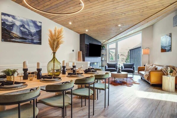 Step inside to discover a spacious and elegantly furnished interior, featuring contemporary décor and high-end finishes throughout. The open-concept living area boasts large windows that flood the space with natural light and provide panoramic views of the surrounding peaks. A cozy fireplace adds warmth and ambiance, perfect for relaxing after a day of outdoor adventures.