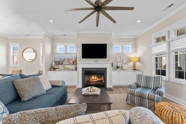 INDOOR LIVING: Smart TV, fireplace, dining table, bar area w/ wine fridge, board games, books, open floor plan