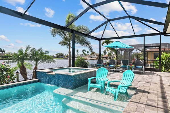 Chic pool home w/ designer, heated, saltwater pool,attached spa, covered patio