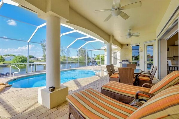 Villa Starlight is a luxury waterfront home located in desirable SW Cape Coral in a quiet neighborhood. The home features 3 bedrooms, 3 bathrooms, office, fireplace, heated pool & jacuzzi and a large over-water dock with Tiki hut. The home also boasts a new luxury chef's kitchen with new high-end appliances and is fully equipped with the latest designer features. The office/den features two dual-screen work stations and wireless printer to allow easy hook-up of one or two laptop computers. There are large screen smart HD TVs in all bedrooms and living room, and a smaller TV in the third bedroom.