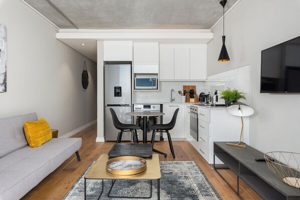 In Cape Town's vibrant De Waterkant and Green Point area, The Docklands offers a modern retreat with high-end finishes, fast WiFi, aircon and a large balcony. Enjoy the rooftop pool deck with braai facilities or relax in your secure covered parking space.