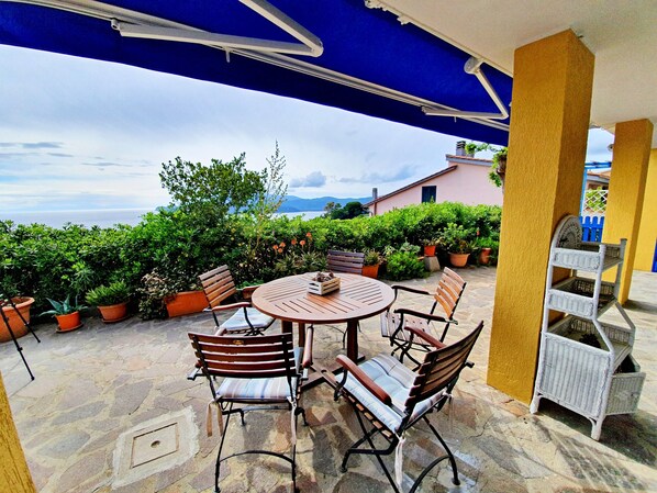The apartment boasts a partially covered, private terrace, furnished with table and chairs. Here you have a fantastic view of the sea and the islands of Pianosa and Montecristo.
