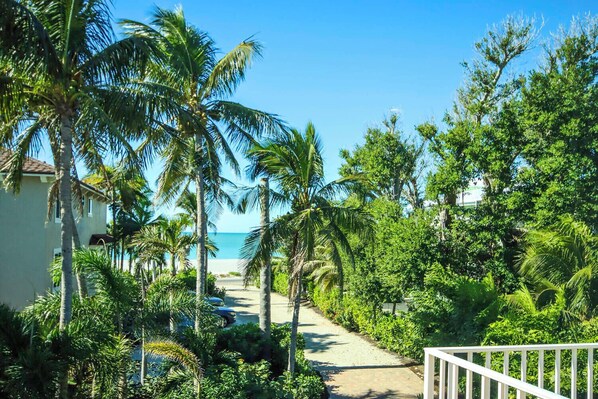 The primary suite at Almost Heaven is its own grand oasis of luxury. Slumber in spacious comfort in the premium king-size bed, or read-in bed propped against the bolster and throw pillows to the light of large lamps and recessed ceiling fixtures. A large, private balcony faces west (sunny in the afternoon) and looks down the short driveway to the Gulf of Mexico beach.