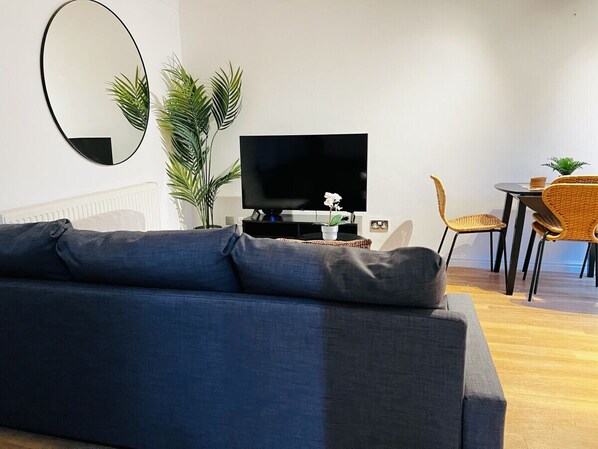 Stylish, modern apartment, fully furnished and serviced. Equipped with essentials like coffee and free WiFi. It features two large double bedrooms and a luxurious bathroom with a full-sized shower. Perfect for a comfortable and convenient stay, offering everything you need for a pleasant experience.