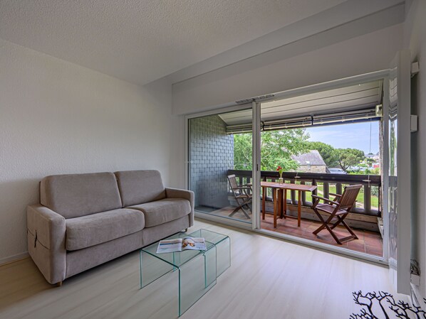 1-room studio 30 m2 on 1st floor. Comfortable furnishings: living/dining room with 1 double sofabed (1 x 140 cm, length 190 cm). Exit to the balcony. Sleeping alcove with 2 beds (80 cm, length 190 cm). Kitchenette (2 ceramic glass hob hotplates, toaster, kettle, microwave, electric coffee machine). Shower, sep. WC. Electric heating. Balcony 5 m2, west facing position. Terrace furniture. Facilities: washing machine, hair dryer. Internet (WiFi, extra). Parking, garage space n 29. Please note: non-smokers only. Smoke alarm. Offer by a private individual according to Art. 155, IV of CGI. 56034000639D7