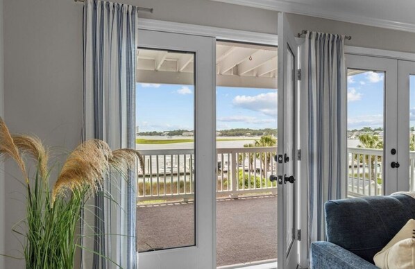 Ideal condo for couples, families, friends or a relaxing work getaway. The bright and comfortable living area features a spacious sofa and loveseat, plus a large smart TV with your favorite streaming apps. There’s also a dedicated workspace with a desk, office chair, and extra monitor, so you can work remotely while enjoying serene canal views.