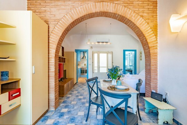 The house opens onto a spacious living area, where natural stone arches frame a bright and inviting space, featuring a comfortable double sofa bed and a charming dining area. Every corner tells the story of a thoughtfully curated interior, cheerful and colorful, blending traditional local elements with modern touches to create a harmonious and enchanting ambiance. Daylight gently filters through the windows, warming each moment with intimacy and comfort.