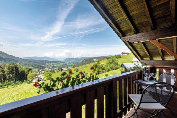 The outdoor area boasts a south-facing balcony with great views of the mountains, including the “Schlern”, as well as a shared garden with seating furniture and a playground, where you can have breakfast in the morning or spend the evenings with a glass of wine while looking over the surrounding mountains.