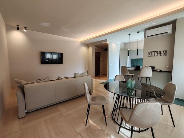 A small yet elegant kitchen, finished with great attention to detail, featuring refined colors that convey harmony and simplicity. It is equipped with a practical induction cooktop and everything needed to make your stay pleasant and functional. To complete the experience, a Nespresso coffee machine is always available, so you can enjoy the pleasure of an excellent coffee every day.