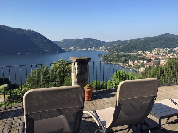 The living space is an open concept, offering captivating views of Lake Como. It encompasses a cozy living room with a fireplace, a dining area, a functional workspace, and a well-appointed kitchen. The upper floor constitutes the sleeping quarters, featuring three bedrooms, each equipped with its private en-suite bathroom. All rooms are air-conditioned, excluding the single bedroom. In one of the queen bedrooms, there's an additional single sofa bed located in the loft area.
