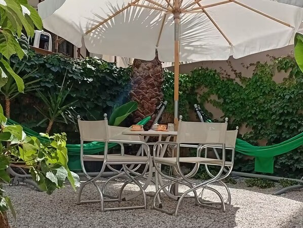 A shared garden with hammocks, shaded seating, power outlets and strong Wi‑Fi — perfect for relaxing, enjoying meals or working outdoors.