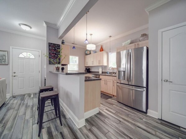 ☀ Sleeps 6 comfortably ☀ 3 bedrooms | 2.5 bathrooms ☀ King primary suite + 2 queen bedrooms ☀ Dedicated office & high-speed internet ☀ 75” Google Chromecast TV + TVs in all bedrooms ☀ Fully fenced backyard with BBQ grill ☀ Short drive to Plaza Midwood, NoDa, restaurants & concerts