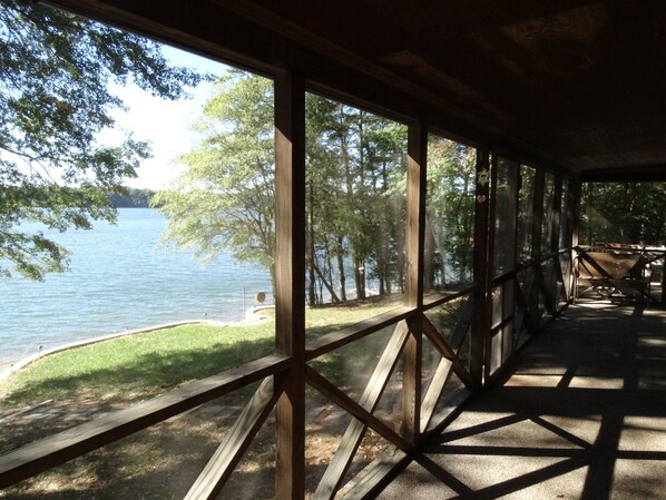 The home, Boardwalk, is an ideal vacation rental. All four bedrooms are upstairs. The downstairs is one large room containing the living room, dinning room and kitchen. There is a large, shaded, open, upper deck across the entire length of the home facing the lake. Below this deck is a screened in porch which is adjacent to the living/dinning room. There is a full bath on each level. The upper level bathroom also contains the home's washer and dryer.
