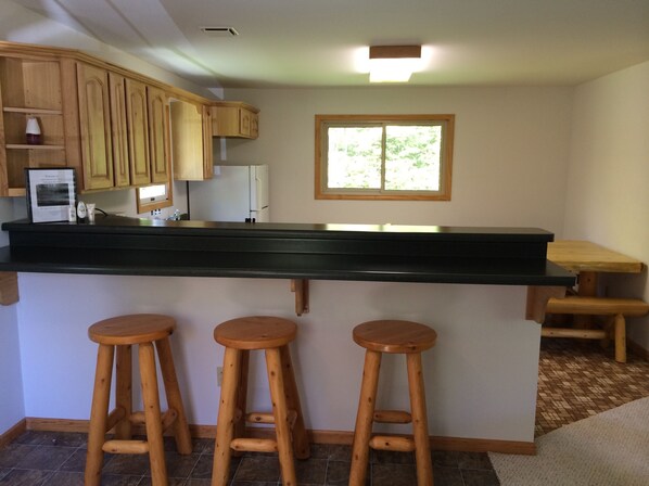 Our home has 2 large bedrooms and one bathroom. Bedroom #1 has two bunk beds (1-twin/full and 1-twin/twin) and a small seating area with 32" TV and DVD player. Bedroom #2 has a king size bed and 43" TV with Blu-ray player. Pack n play also available. Open kitchen stocked with all of the cooking essentials that you may need, such as pots, pans and dishes. Large kitchen table that easily seats 8 people along with a bar that seats 3. The living room has a futon couch that can be unfolded to use as more sleeping space and a large couch. DirecTV available on the television in the living room along with a DVD and VHS player.