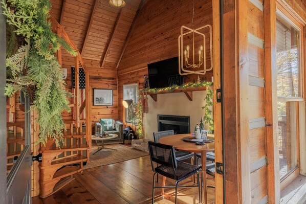 - Cozy dining setting next to the fireplace hearth.