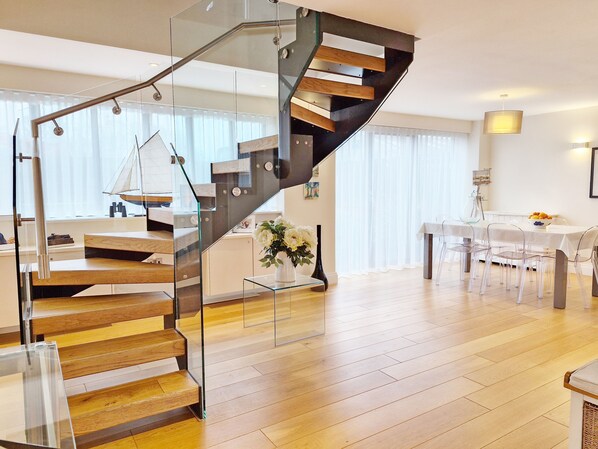 Upon entering the modern property, you will be greeted by the spacious living area and a modern stair case. The living area has a comfortable seating facing the TV with a DVD player, ideal for relaxing after a long day walking and exploring the beautiful sights. Downstairs there is a fully equipped kitchen with a kettle, cafetiere, dishwasher, cooker, fridge, freezer, microwave, toaster, washing machine and tumble dryer, everything you need to feel at home in this wonderful holiday home. There is also a downstairs WC.