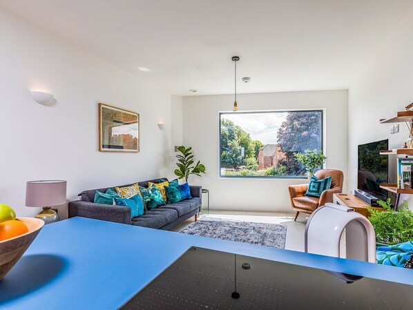 Enter the front door into the spacious and stylish open plan kitchen and living area. The living area is bright with plenty of seating with a large comfortable sofa and two additional chairs. There are books and a Smart TV in the living area. (You will need to use your own log in details for the TV applications.) The large picture window allows plenty of light into this beautifully decorated and comfortable space.