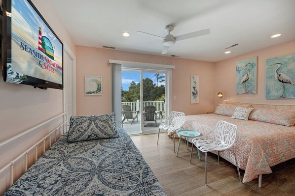 Bedroom 1 is peaceful and serene with colors of coral and sea, a comfy King Bed, plus a Twin Daybed, and en suite bathroom. Looking for a quiet start to your day? Brew some coffee from the comfort of your room and step out onto the spacious Sundeck to enjoy the sights and sounds of Fowling Creek.