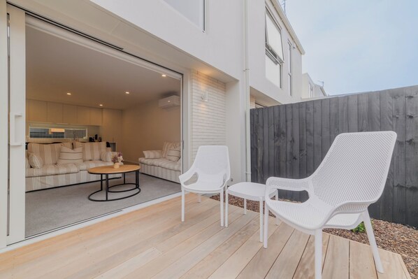 Step outside to the private patio with outdoor chairs, ideal for a quiet coffee, fresh air, or winding down in the evening.