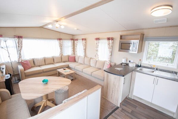 Inside Sunset View you will find all you need for a comfortable stay. An open plan living area with a well equipped kitchen. It includes electric oven and hob, fridge freezer and microwave, an open plan dining area with a roomy lounge with plenty of seating for guests to spread out. On warm days it's wonderful to enjoy drinks and a meal on the decking area overlooking the park.