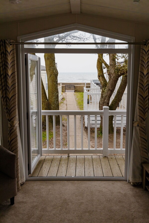 Light and airy, 'The Retreat' is perfectly positioned in the second row of the park near the small footpath leading out to the promenade. There is a clear, uninterrupted sea view from the lounge, kitchen area and from a small front deck that is accessed by double patio doors. The front deck has the sun most of the day and is just right for watching the world go by. In the winter it is wonderful to have a morning cuppa in the lounge while watching the sun move across the sky.