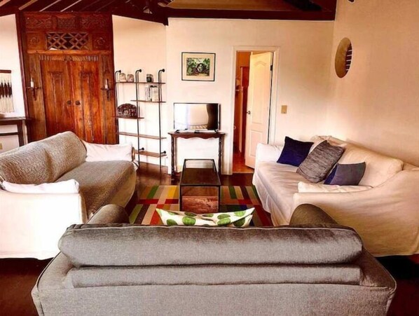 Take it easy at this unique and tranquil getaway. Located on 11 acres this eclectic property is one of the oldest estates on St Croix. Enjoy views of north and south shore from your private balcony! An 8min drive brings you into the heart of historic Christiansted or a 5min drive east takes you to some of St Croix most beautiful beaches. Access to onsite private dining club. Onsite yoga and massage by appt