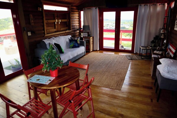 Perched atop a 3-acre mountain farm, this charming cabin offers breathtaking views—lush forest on one side and city lights on the other. The cozy space includes a private bath, kitchenette, living and dining area, plus a terrace with a heated jacuzzi perfect for stargazing. Guests also have access to a gazebo with a half bathroom and an outdoor BBQ area, both overlooking the city. A peaceful escape surrounded by nature, yet close enough to modern comforts.